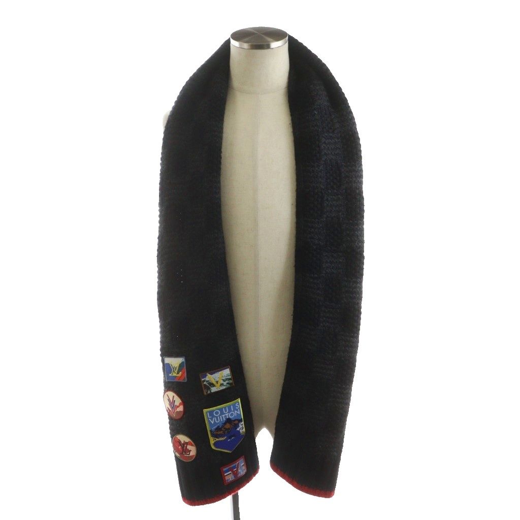 ルイヴィトン LOUIS VUITTON エシャルプ ヘルシンキ マフラー パッチ ロゴ カシミヤ レザー 黒 ブラック M 71108 AN 2 OH