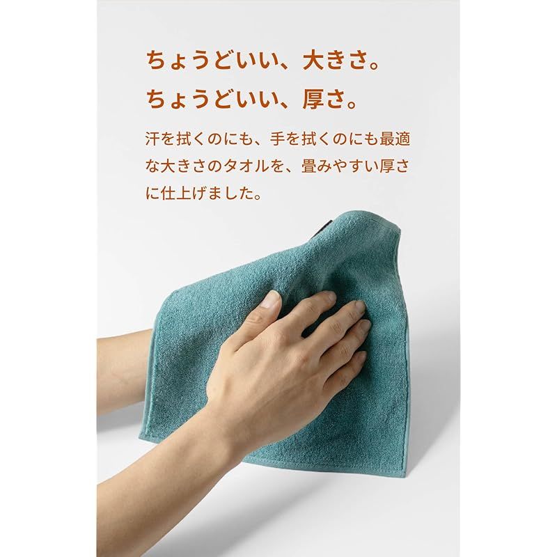 ちょうどいい、大きさ。ちょうどいい、厚さ。汗を拭くのにも、手を拭くのにも最適な大きさのタオルを畳みやすい厚さに仕上げました。