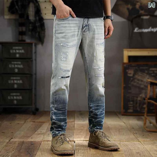 商品名:メンズ ファッション 服 男性用 オシャレ シンプル 大人 かっこいい 大きいサイズ ストリート 紳士服 春秋 リップド スリム 裾細 ジーンズ アメリカン クラシック ダメージ 加工 グラデーション カジュアル 九分丈 パンツ