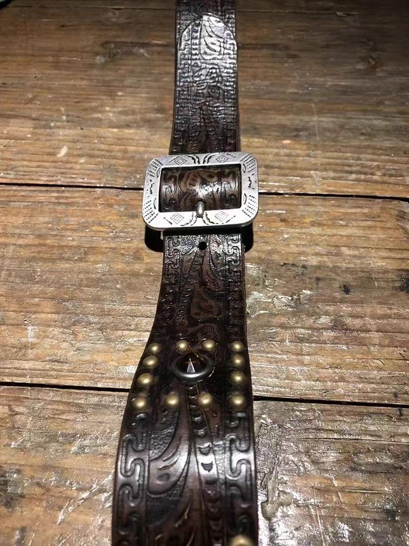 RLのスタッズベルトです。レザーカービングの様なデザインが型押しされており、スタッズやジェルスタッズが打ち込まれたデザインです。細かな擦れ等の使用感はございますが、長期使用によるレザーの歪みなど少なくまだまだお使いいただけます。サイズ表記はございませんが最小でW32、最大でW36インチ相当です。バックルはボタンを外せば取り換えることが出来ます。