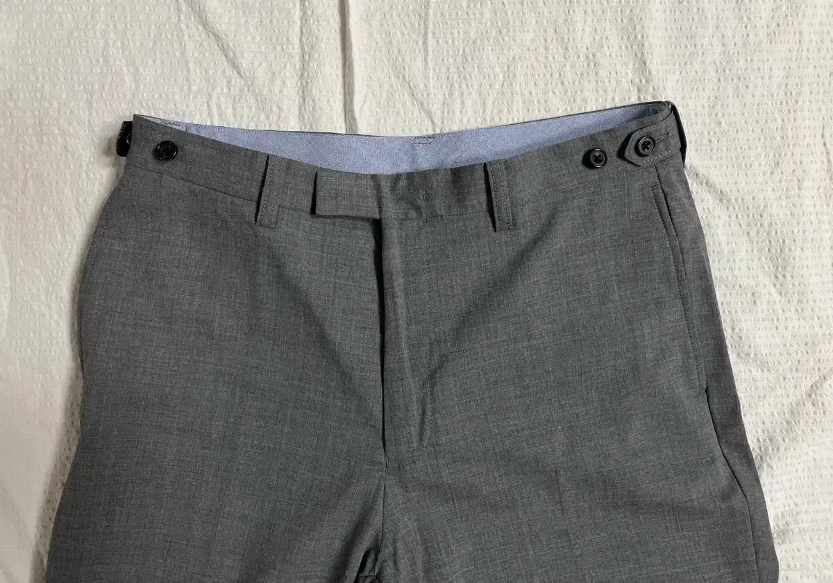 軽快な丈感と裾のターンアップ、サイドボタン、ウエストバックルなどの繊細なディテールが魅力的なパンツで、ウールトロピカルとコーデュラ混紡生地で軽くてドライなタッチ感で着心地が良いです。