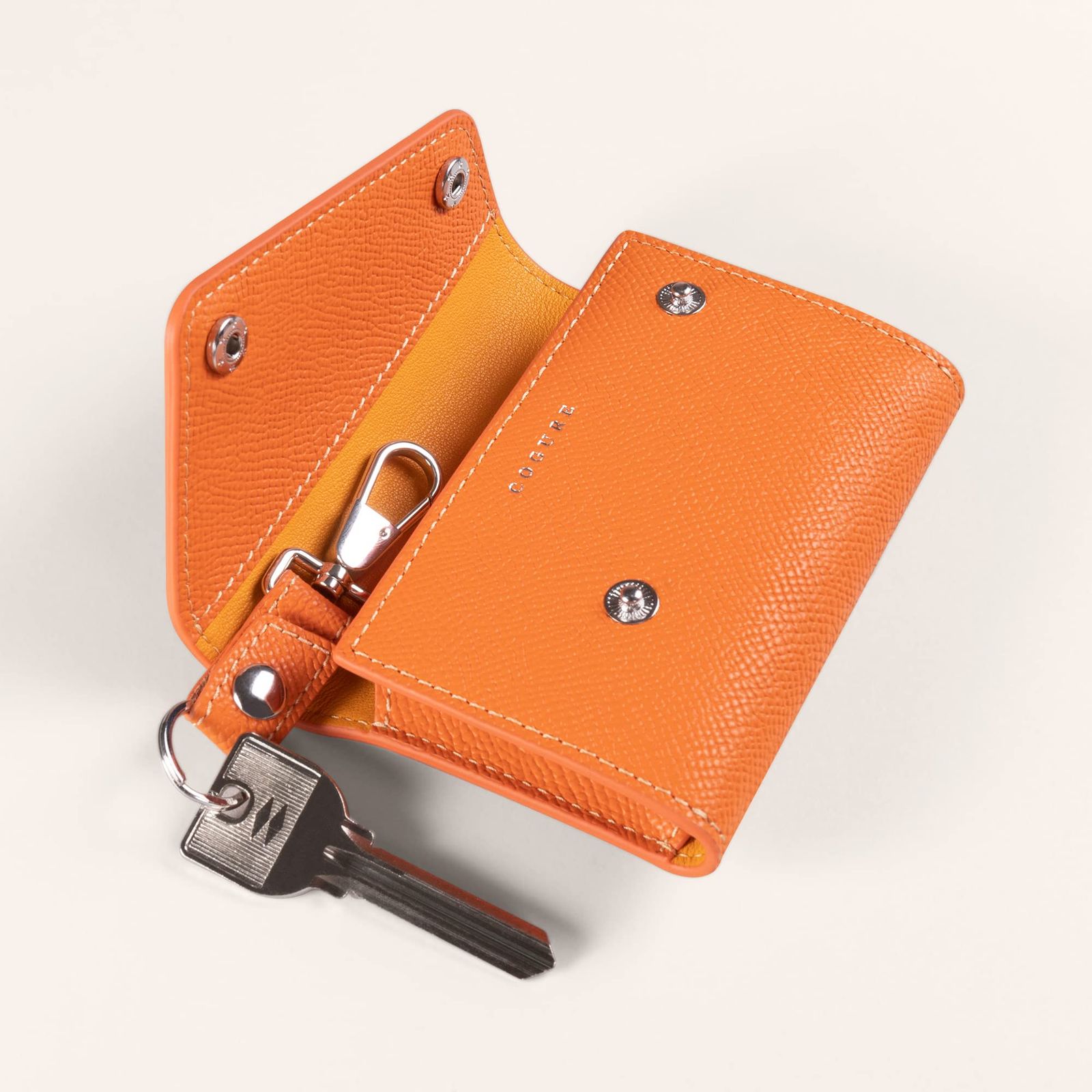 ツルツル・つやつやとした美しいエッジを実現するために、「ヘリ落とし」、「やすり掛け」、「コバ塗り」などの職人技を何度も繰り返し、丁寧に仕上げられています。継ぎ目のない一枚革を三つ折りにし、鍵をしっかりと包み、手に馴染みやすい美しいデザインに仕上げました。外側にはヨーロピアンエンボスレザー、内側にはスムースレザーを採用し、表も裏も本革という贅沢な仕様になっており、二種類のレザーの質感をお楽しみいただけます。