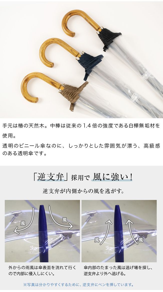 外からの雨は通さず、逆に内側からの風を逃がすという役割を果たす「逆支弁」という構造を採用し、通常の傘に比べて裏返りを軽減。逆支弁なので、雨漏れの心配はありません。もちろん、全面ビニールなので視界はクリアで良好。