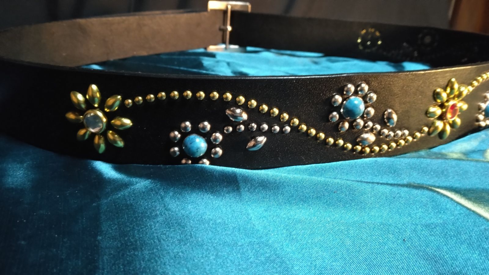 ※画像のベルトの図柄はウエスト周り80㎝位の方用のスタッズ図柄でして、ウエスト90㎝以上の方には図柄が画像より短く入ります。ウエスト90㎝以上の方、バランス良くスタッズを入れたい方、よろしければ追加料金2000円でツタを1スパン追加して入れます。購入前に一言言って下さい価格変更致します。