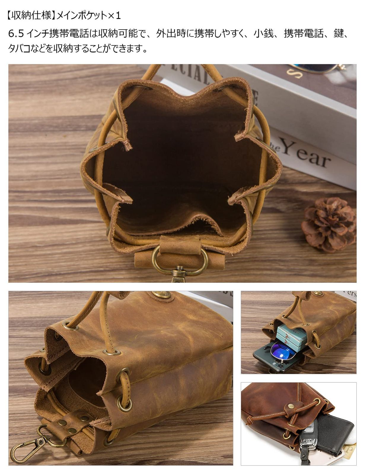 Whatna天 然 厚 手 牛革 小銭入れ コインケース メンズ レディース 2way巾着袋 ミニサコッシュ カラビナポーチ ベルトループ ミニウエストバッグポーチ 本革6.5インチiphoneを収納可 イヤホン収納ケース カラビナ付き (ブラウンD)
