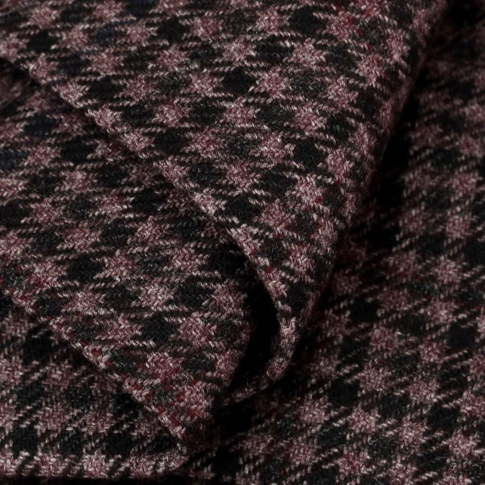 起毛感のある秋冬向きウールポリエステルを用いたスラックスパンツ。メランジ感のあるパープルにブラック系のシンプルなチェックを配した一本。