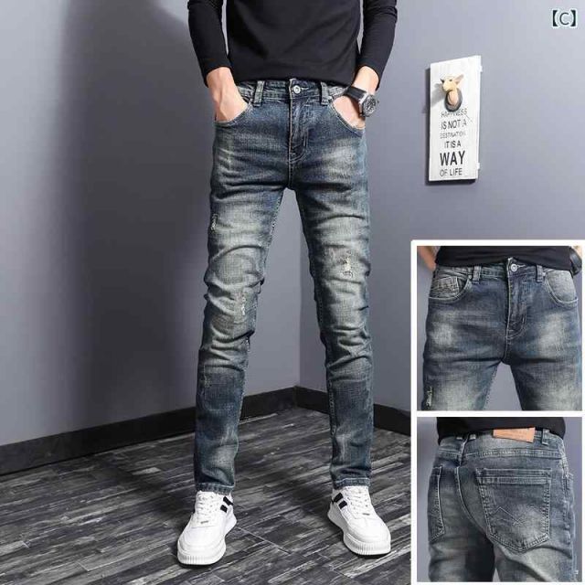 31 メンズ ファッション 服 オシャレ シンプル 大 かっこいい 大きいサイズ ストリート 紳士服 春 秋 レトロ ブルー ウォッシュ加工 ジーンズ スリムフィット パッチ ロング パンツ