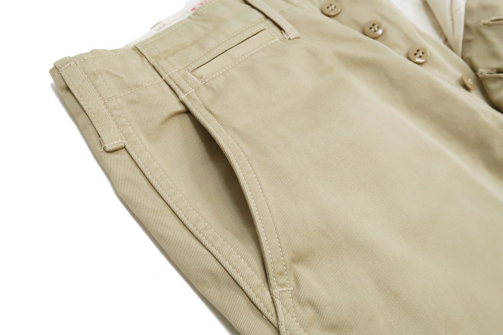 素材はコットン100%のしっかりとしたチノクロスツイル生地です。高密度に織られ強度に優れているチノツイル生地で、ミリタリーらしい頑強で無骨な表情ながら、しなやか履き心地も併せ持つ生地で、オールシーズンで穿ける一本です。