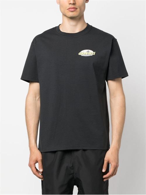 ブラック、コットン、胸にロゴプリント、背面にロゴプリント、クルーネック、ショートスリーブ、ストレートヘムが特徴です。