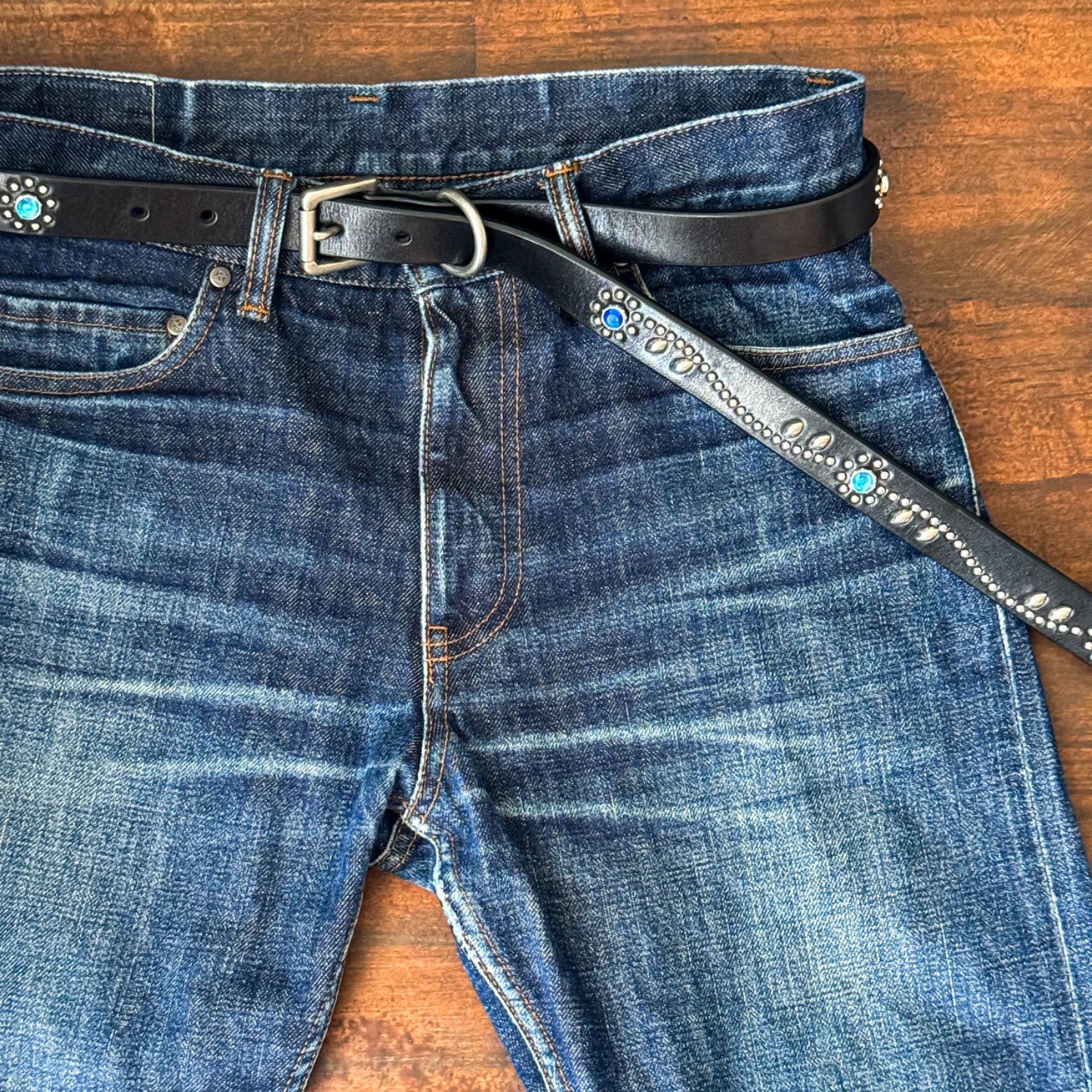 ▪︎HTC.RRL.CALEE等にも使用されるスタンダードリベット社の高級スタッズとナローベルト用にタンナーより取り寄せた厚手のカウレザーを使用して製作したハンドメイドのベルトになります。
