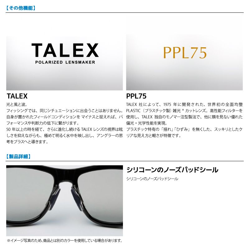 TALEX社によって、1975年に開発された、世界初の全面均整PLASTIC(プラスチック製) 雑光(R)カットレンズ。高性能フィルターを使用し、TALEX独自のモノマー注型製法で、他に類を見ない優れた偏光・光学性能を実現。