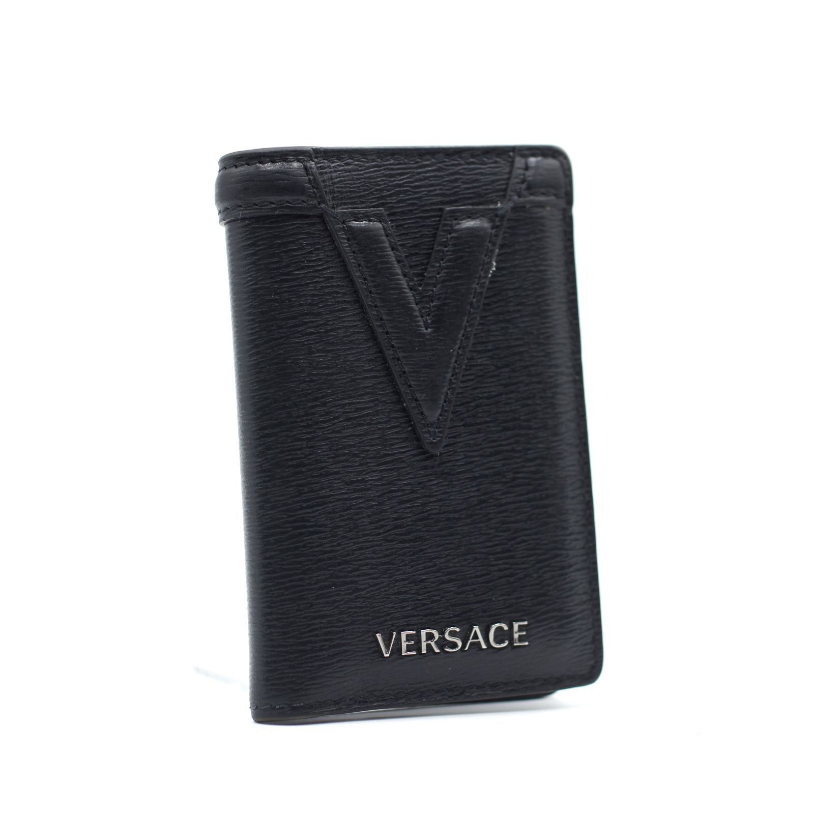 VERSACE ヴェルサーチ カードケース 名刺入れ VIRTUS ロゴ 本革 ブラック メンズ 黒 二つ折り 二つ折りカードケース パスケース