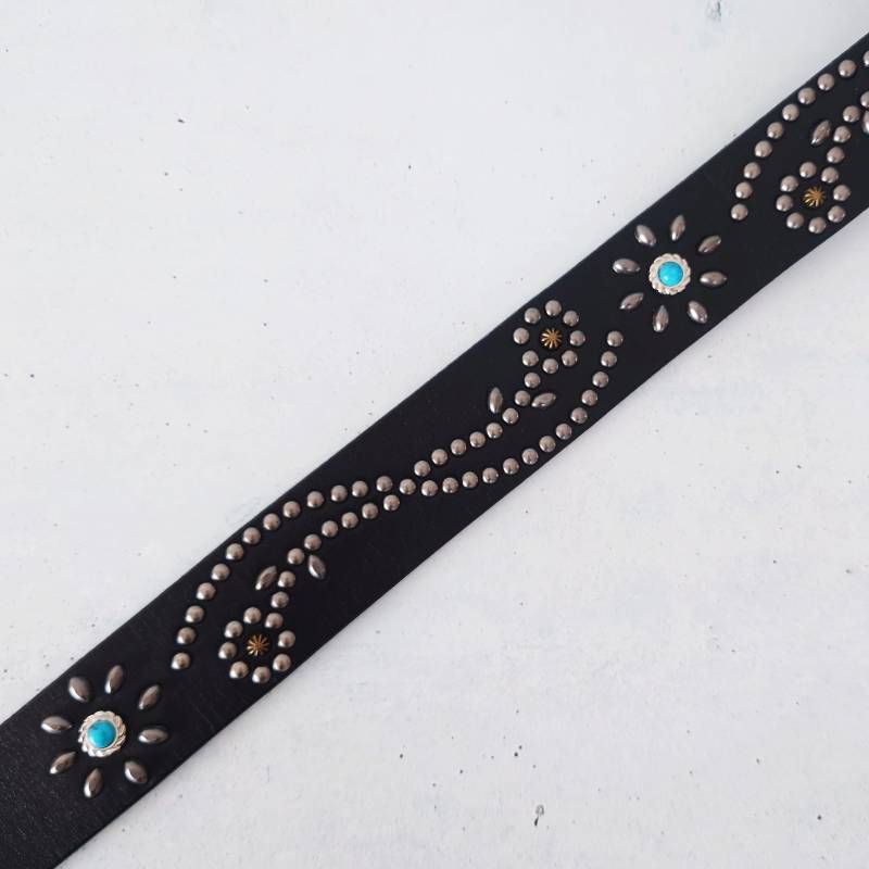 本革 牛革 フラワー スタッズベルト オリジナル アメカジ レザーベルト ターコイズ ウエスタン ブラック COW LEATHER Flower Studs belt Original TRQ BLK
