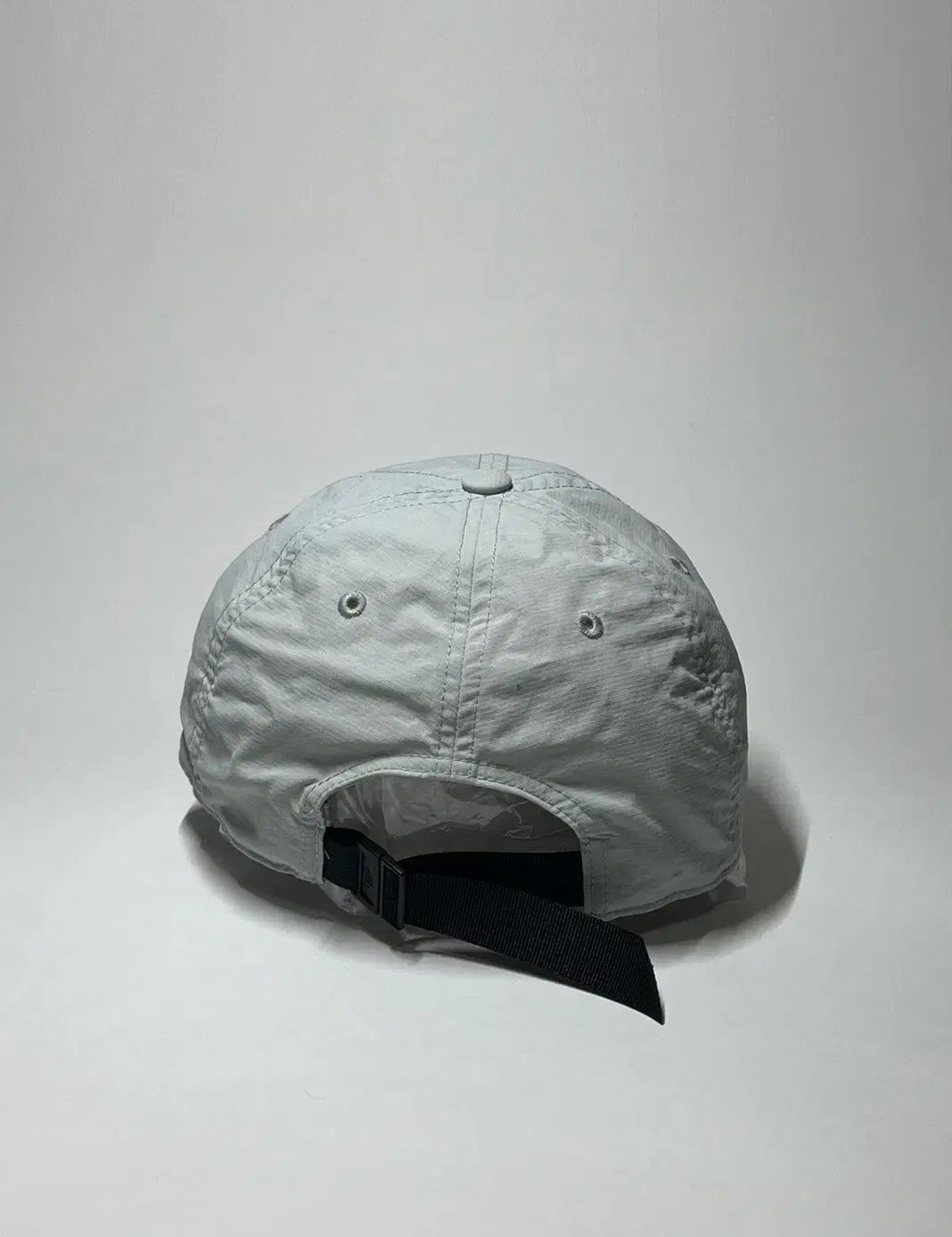 これはザ・ノース・フェイスのナイロングレー/ブルーのボールキャップです。