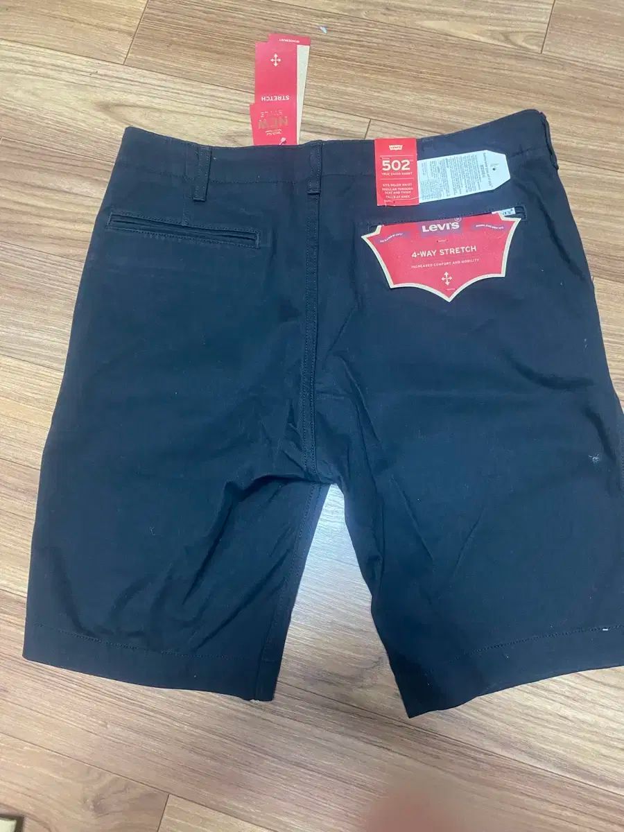 Levi's ブラックのタック付き4ウェイストレッチショーツ。ストレッチが効いているので、アクティビティもやりやすいと思います。ベーシックなスタイルなので、どこにでも合わせられます。別途ご不明な点はありませんので、すぐに安心してお支払いください!