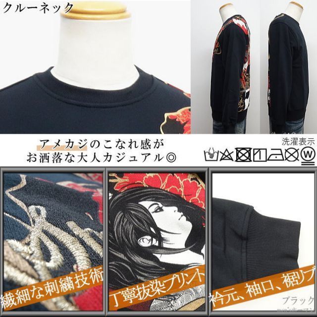 秋冬物 ビッグ有 抜刀娘 バットウムスメ 妃那 三日月に斬る 牡丹 ロゴ刺繍 抜染 裏毛スウェット素材 和柄アメカジ トレーナー 黒 M L XL XXL smtb-k ky YDKG-k メンズ ギフト RCP 223