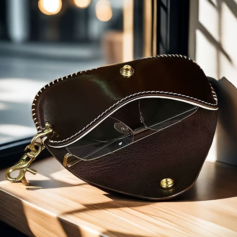 手縫い仕上げの温もりと、真鍮スナップクロージャーの重厚感が大人の魅力を引き立てます。サングラスだけでなく、キー・イヤホン・小銭も整理できる多ポケット設計。
