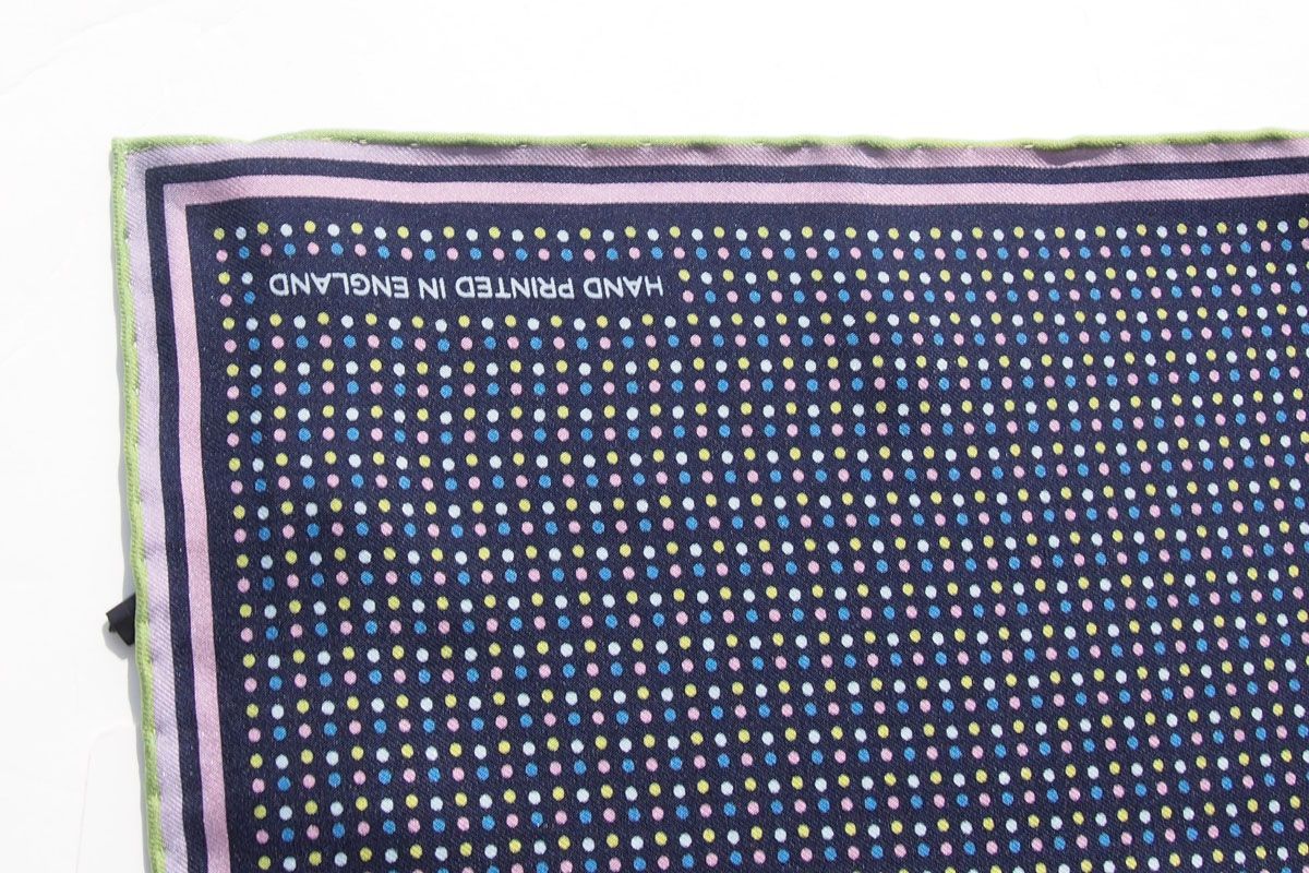 ネイビー地に細かなドットを配した、ターンブル&アッサーのシルクポケットチーフ。